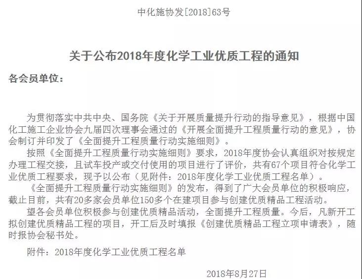 据2018年8月27日中化施协发[2018]63号《关于公布2018年度化学工业优质工程的通知》获悉,内蒙古分公司鄂尔多斯市新杭能源有限公司30万吨/年乙二醇项目粗乙二醇装置获得“2018年度化学工业优质工程”荣誉称号。