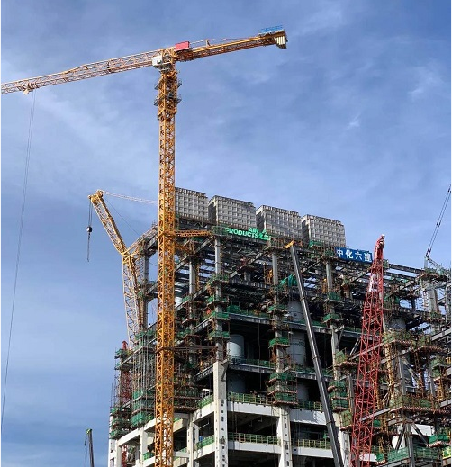 此次封顶的气化框架总高88米,粉煤过滤器为框架最顶层的设备长8.8米、宽8米、高15.55米、重50吨。设备由灰斗、中箱体、清洁室组成,在现场拼装制作。本次成功封顶标志着项目大件设备吊装基本进入尾声,为项目后续的大干工作打下了坚实基础。