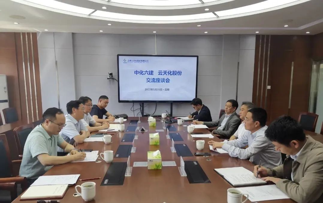 胡二甫介绍了中化六建近几年改革发展基本情况,对云天化集团长期以来给予中化六建的支持表示感谢。他表示,云天化集团长期以来在保供给、稳物价方面践行了国企使命担当,有效保障了人民群众的切身利益,近几年实现了企业稳健快速的发展,值得祝贺。他认为,云天化集团依托在磷、氟等领域的资源禀赋及产业链优势,抢抓国家新能源电池产业高速发展的历史机遇,快速布局新能源材料领域,为企业高速发展选准了赛道。他指出,中化六建高度重视与云天化集团的合作,愿意秉承合作共赢的理念,整合各类优势资源,以高质量的工程建设服务助力云天化集团的高质量转型发展。张文学对胡二甫一行的到来表示热烈欢迎,他系统介绍了云天化集团近几年的企业发展情况和“十四五”期间相关发展规划。他表示,中化六建是一家值得信赖的合作伙伴,希望中化六建在做好在建项目的基础上,双方能在传统业务技改、新能源、新材料及海外业务方面开展更多务实合作。