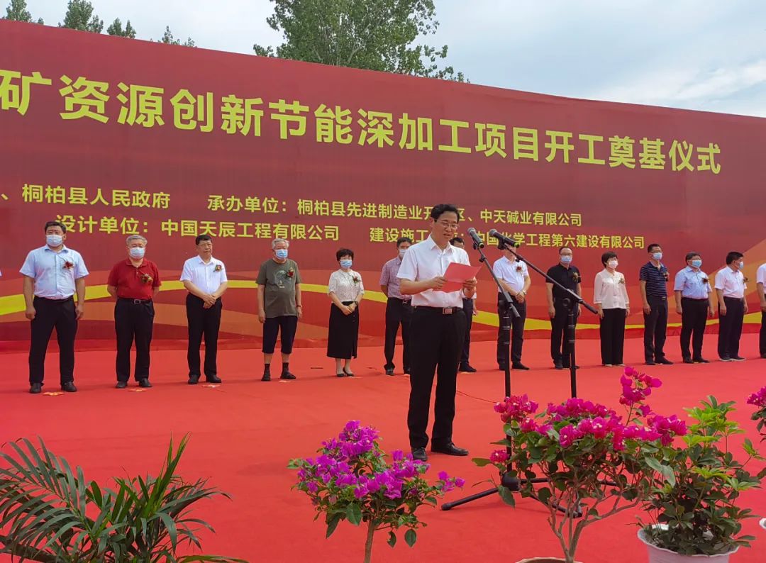 7月16日,中国化学工程第六建设有限公司董事长胡二甫出席中天碱业有限公司碱矿资源创新节能深加工项目开工仪并作为PC总承包商致辞。