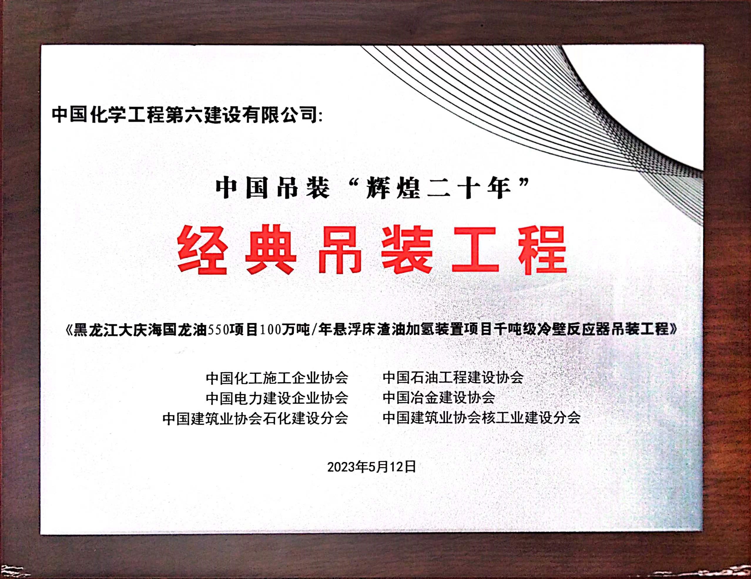 黑龙江大庆海国龙油550项目100万吨年悬浮床渣油加氢装置项目获中国吊装“辉煌二十年”经典吊装工程