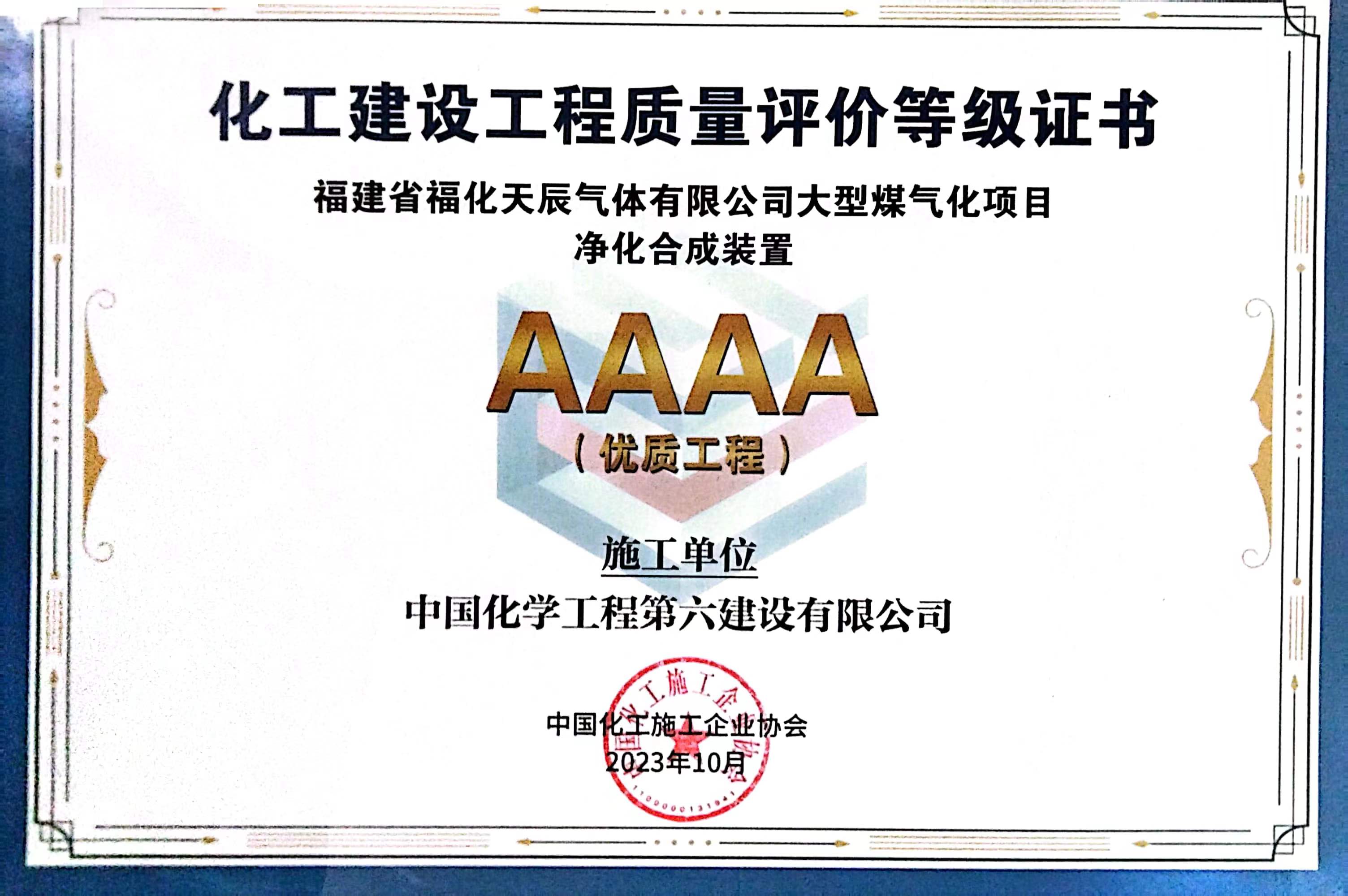福建省福化天辰气体有限公司大型煤气化项目净化合成装置项目获化工建设4A优质工程