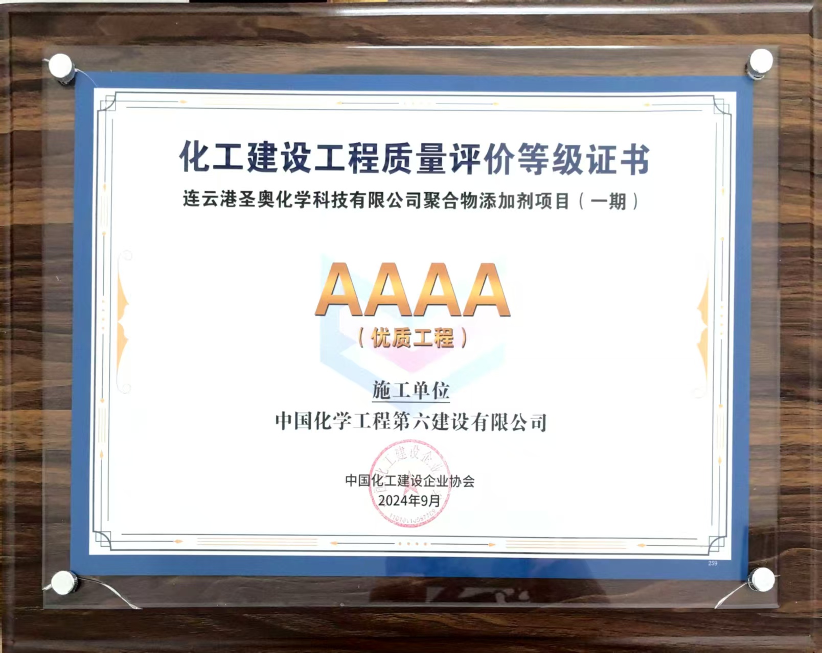 连云港圣奥化学科技有限公司聚合物添加剂项目(一期)获化工建设4A优质工程