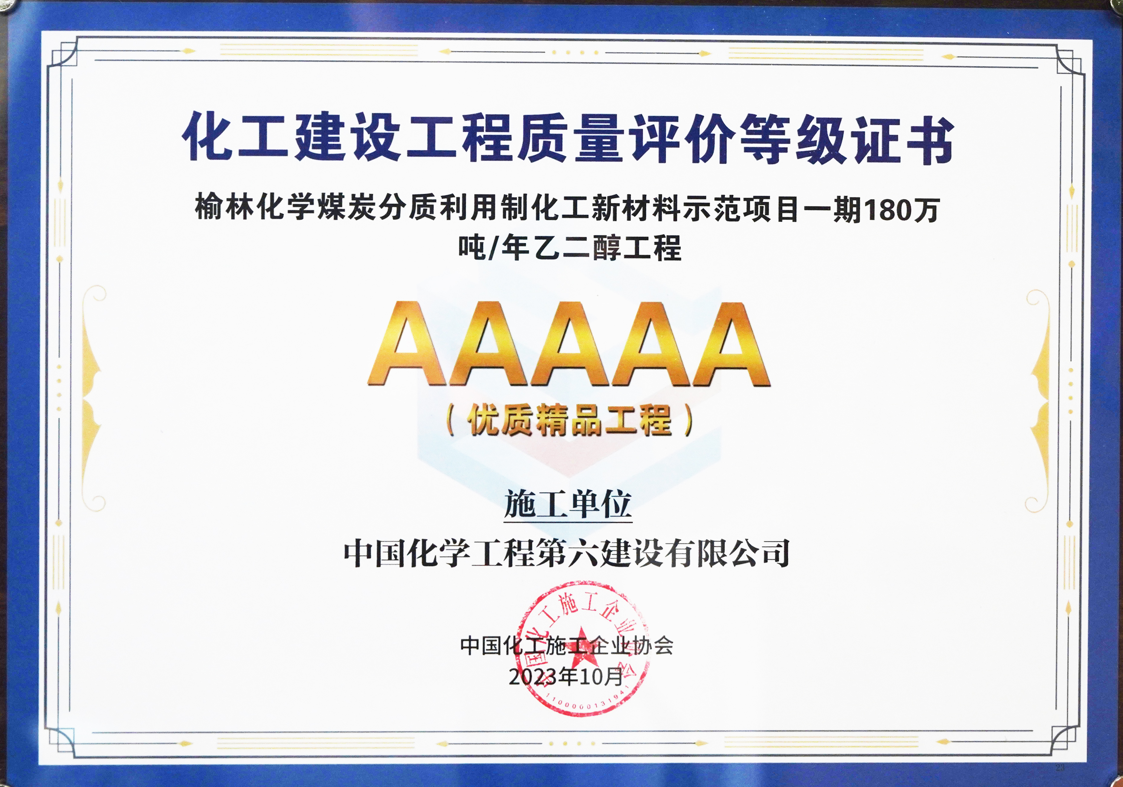 榆林化学煤炭分质利用制化工新材料示范项目一期180万吨年乙二醇工程获中化施协5A优质精品工程