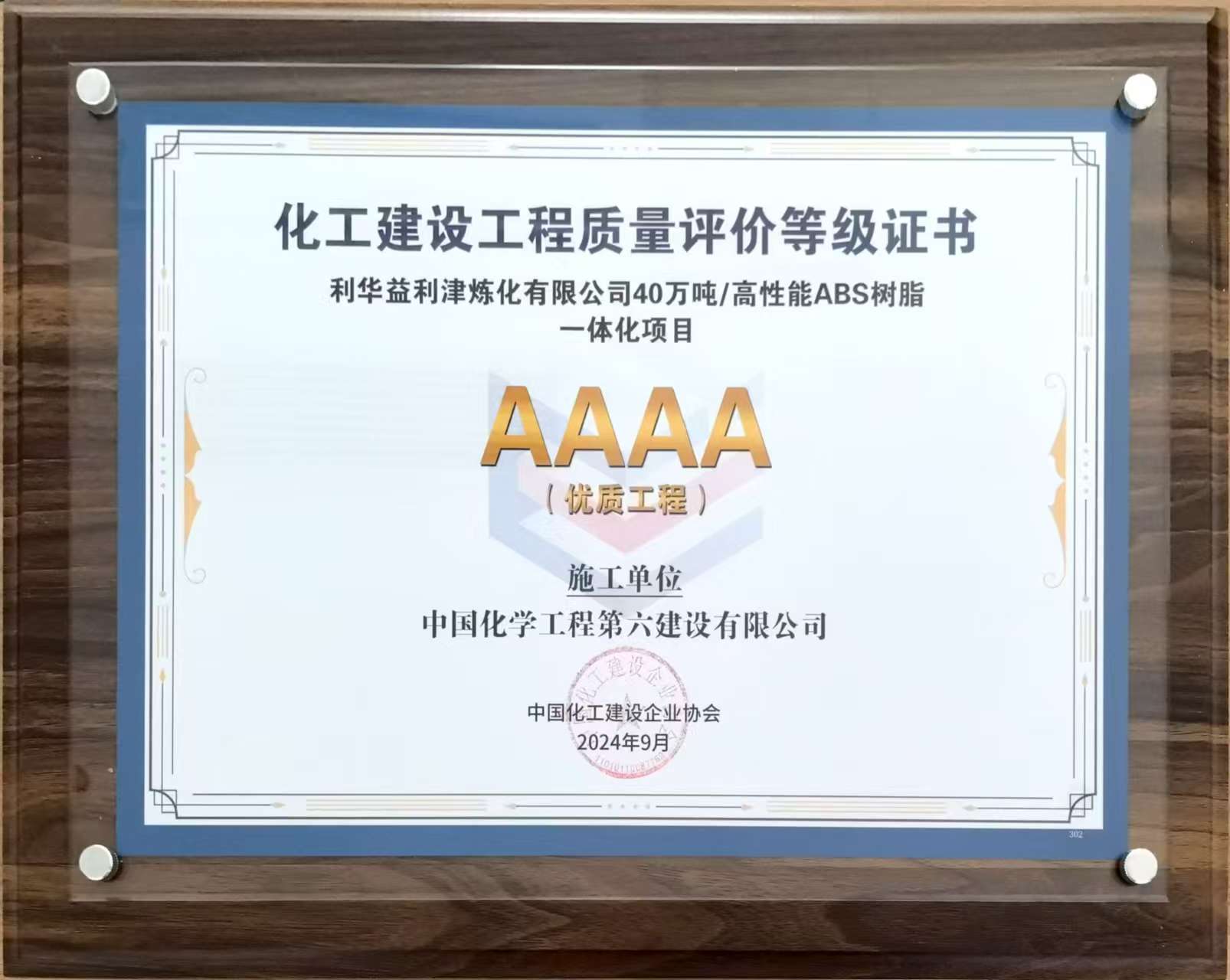 利华益利津炼化有限公司40万吨年高性能ABS树脂一体化项目获化工建设4A优质工程
