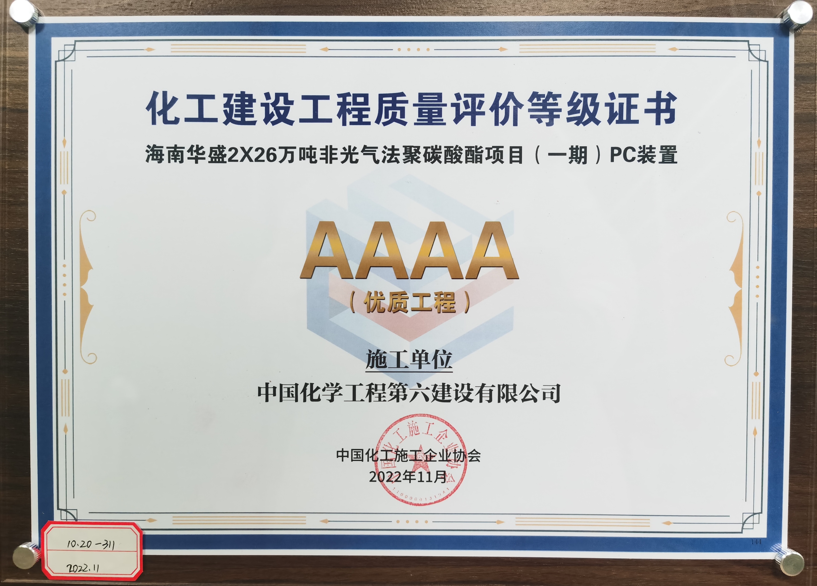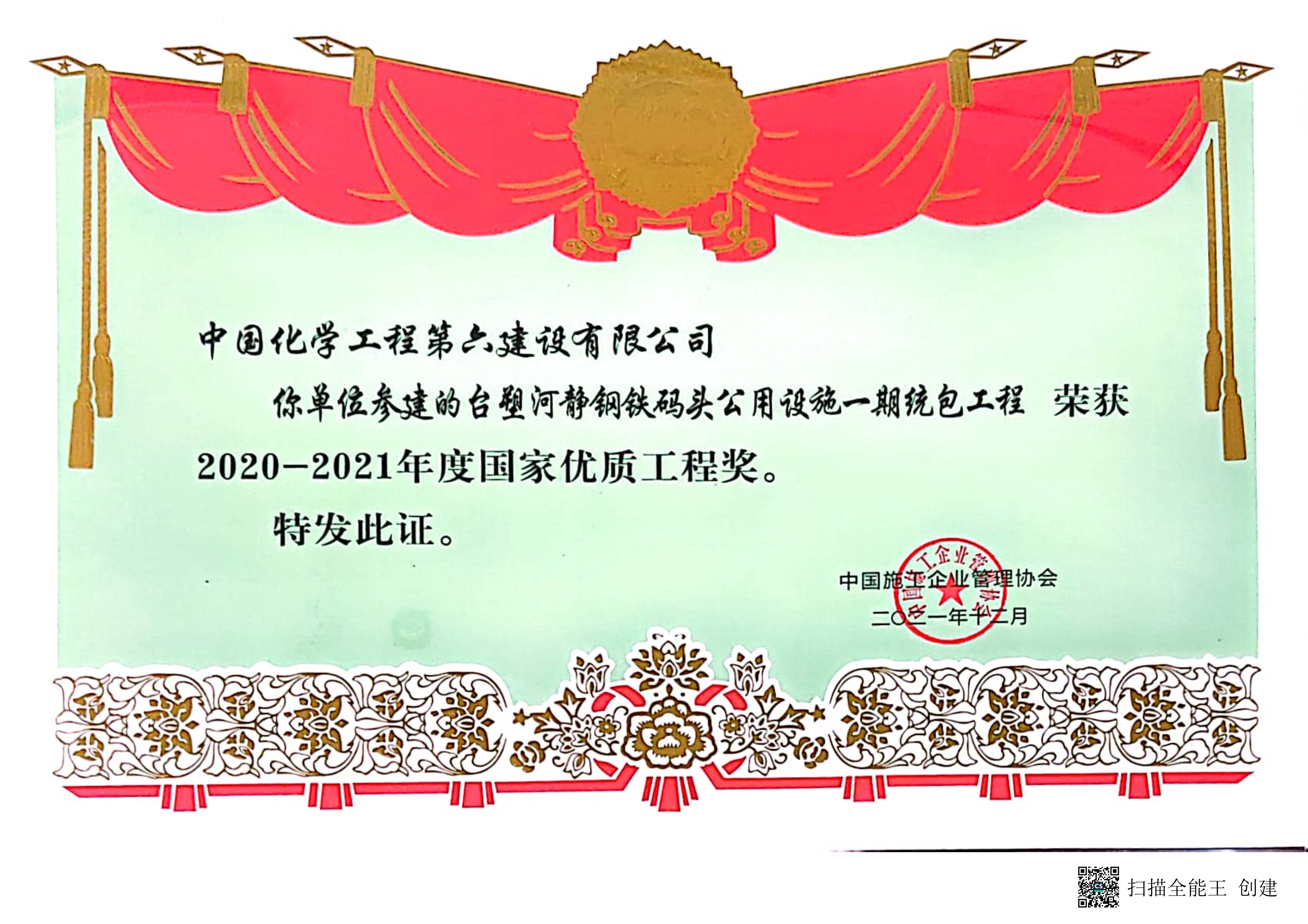 台塑河静钢铁码头公用设施一期统包工程获2020-2021年度国家优质工程奖