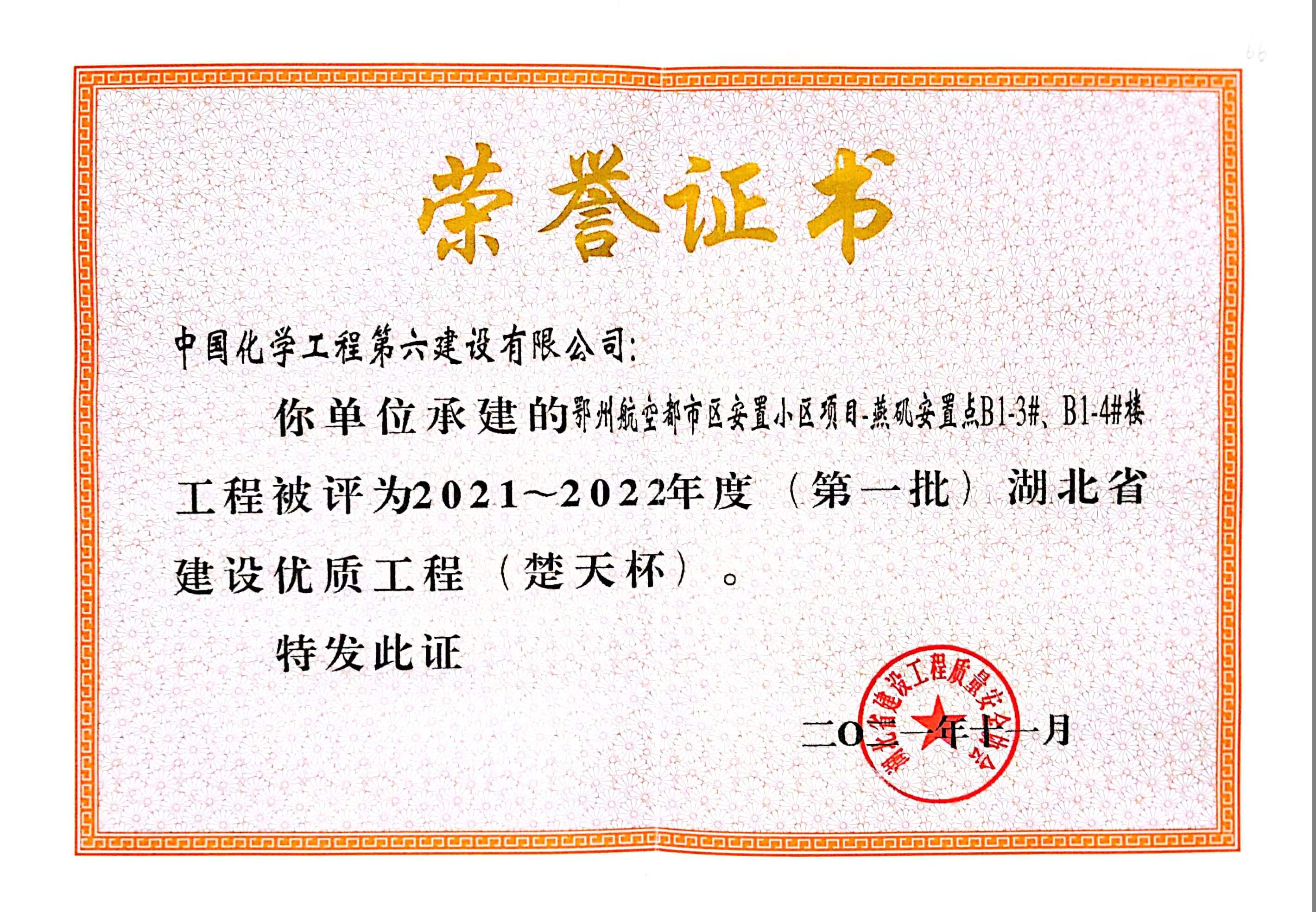 鄂州航空都市区安置小区项目—燕矶安置点B1-3#、B1-4#楼项目获得湖北省楚天杯