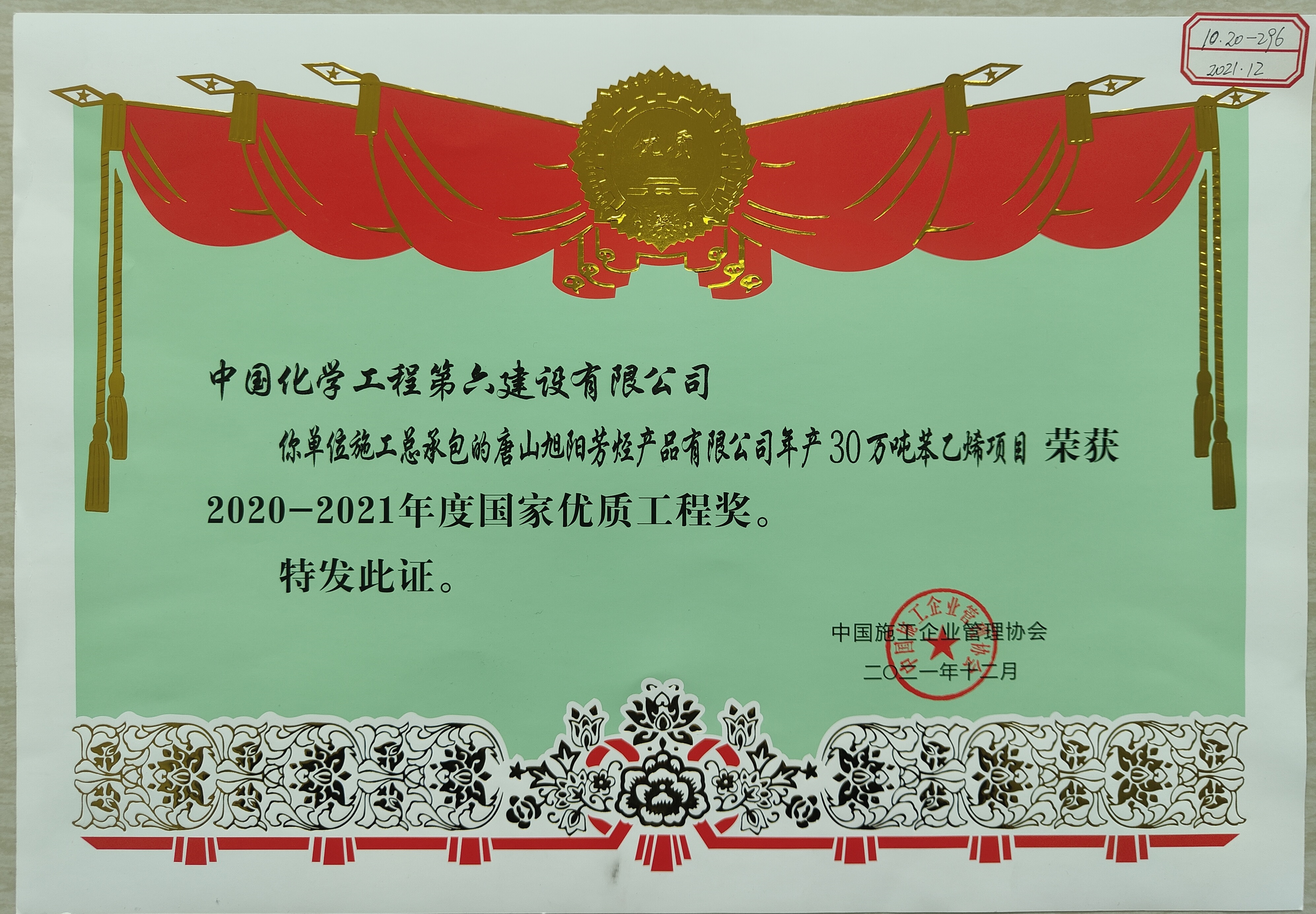 唐山旭阳芳烃产品有限公司年产30万吨苯乙烯项目获2020-2021年度国家优质工程奖