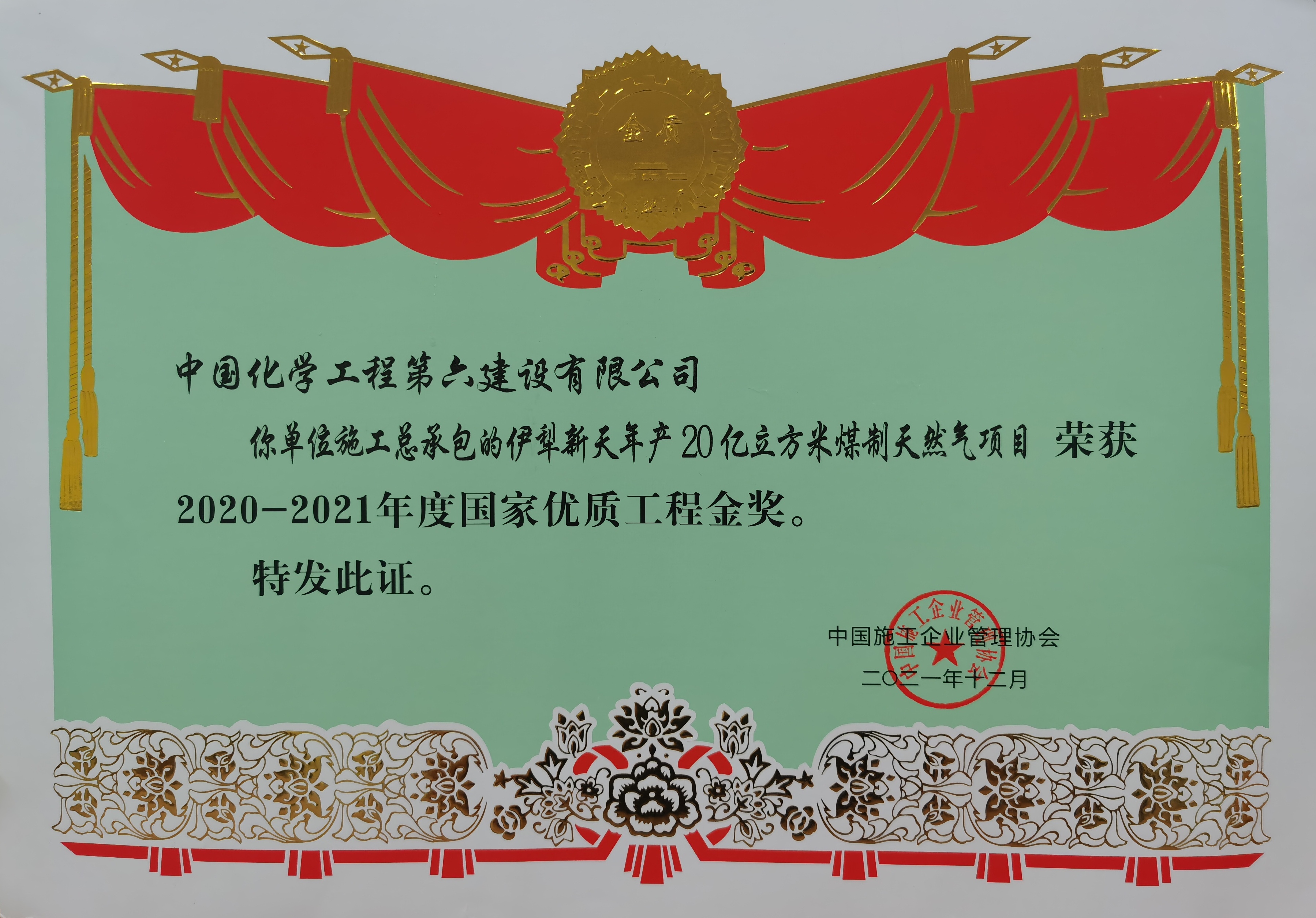 伊犁新天年产20亿立方米煤制天然气项目荣获2020-2021年度国家优质工程金奖