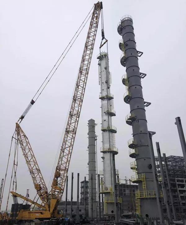 该装置设备中的加压塔高达61.4米,重达131吨,常压塔高达65米,重达152吨,采用650吨履带吊进行吊装。