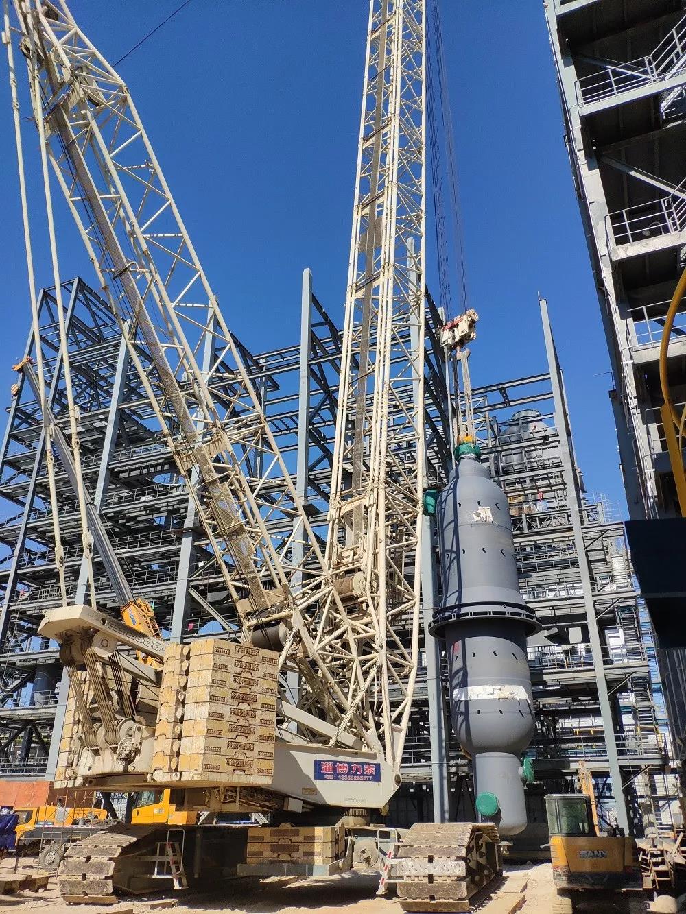 本次吊装的换热器是重整装置的核心设备之一,是整个项目中重要的进料换热器。该换热器直径3.7米,高20米,重215吨。为确保吊装顺利,设备负责人精准测量,确定吊车站位,认真编写吊装方案,采用650吨履带吊为主吊,500吨汽车吊溜尾的吊装方式,一次吊装成功。