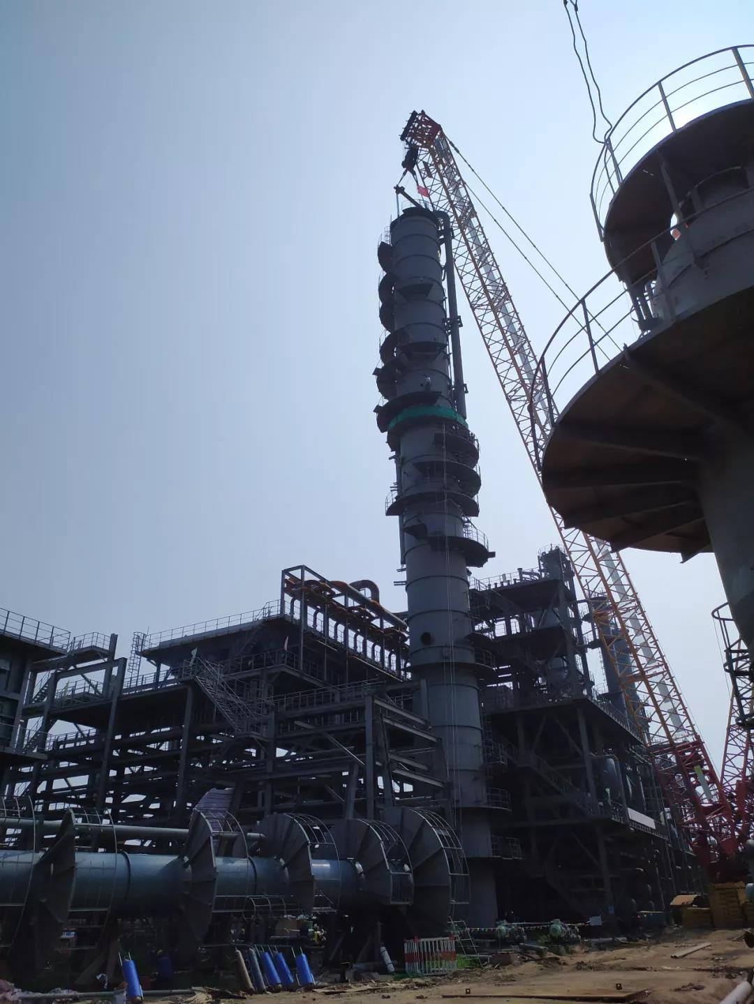山东分公司山东东方华龙项目主分馏塔上段吊装完成
