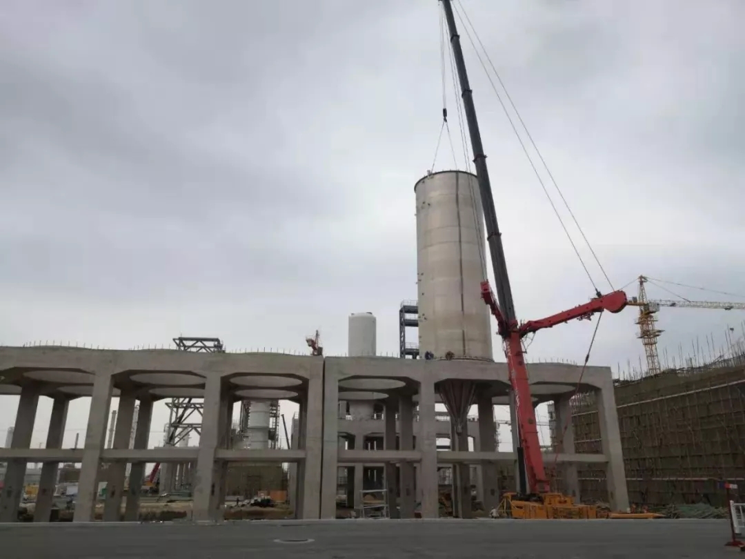 粒料均化框架总共有料仓14台,这是第一批两台料仓吊装。此次吊装的成功,标志着HDPE项目料仓安装工程正式拉开序幕。