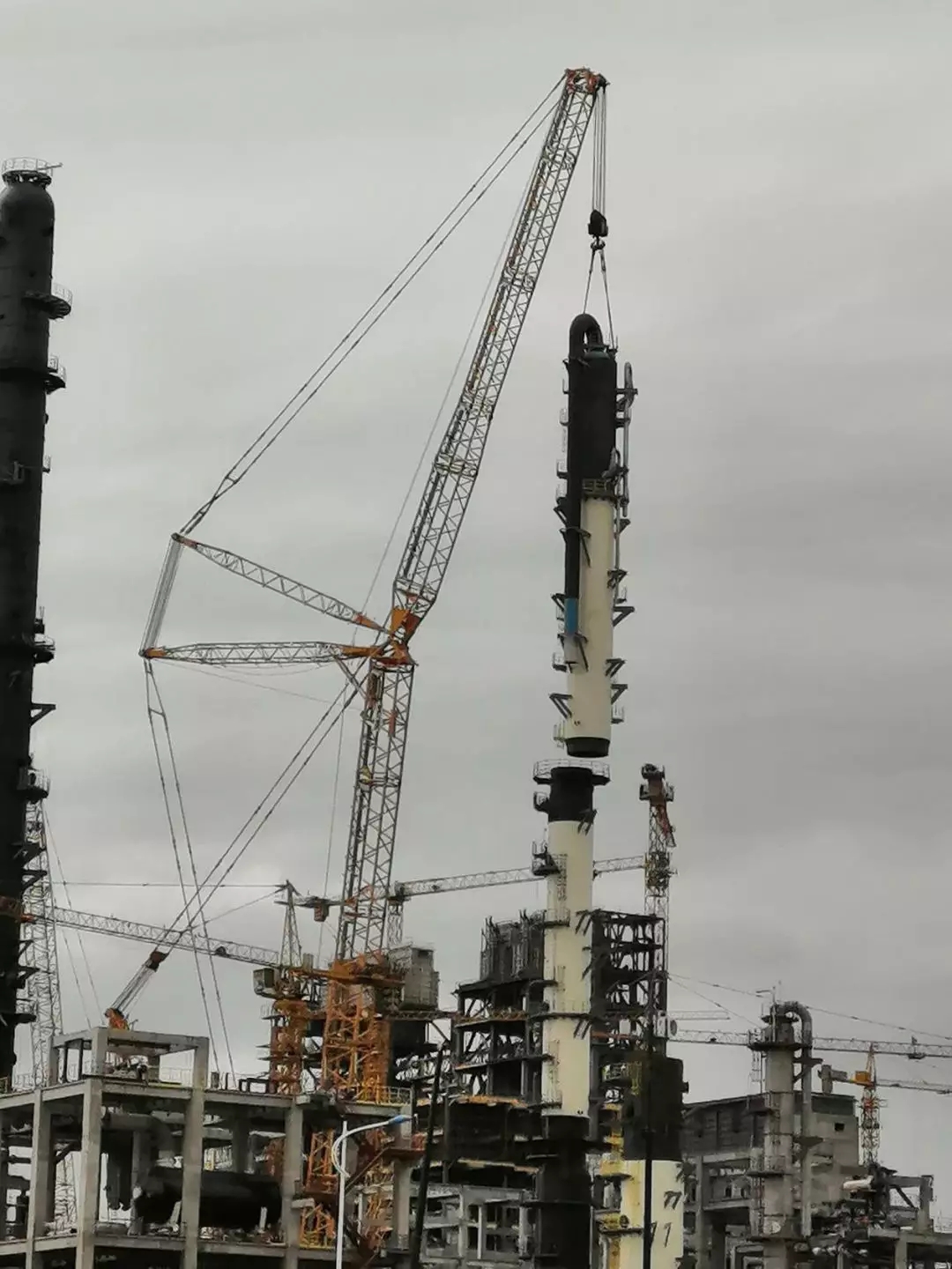 该塔总高度101.72米,总重量430吨,底座最大直径7.26米,分三段吊装就位,是整个宝丰甲醇项目的第二高塔。