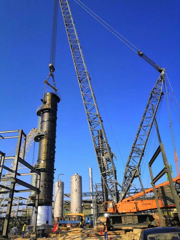 变换气洗涤塔(522T001)是项目净化装置中的核心设备,分三段吊装。此次吊装的第一段设备重约270吨,是三段设备中最重的一段。第一段设备重量重且吊装场地空间狭小,化工机械厂采用750吨履带吊主吊,350吨履带吊溜尾,两台25吨汽车吊辅助挪动走道板,一次吊装成功,得到了业主、监理的一致好评。据悉,变换气洗涤塔(522T001)后两段吊装工作将于12月底前完成。