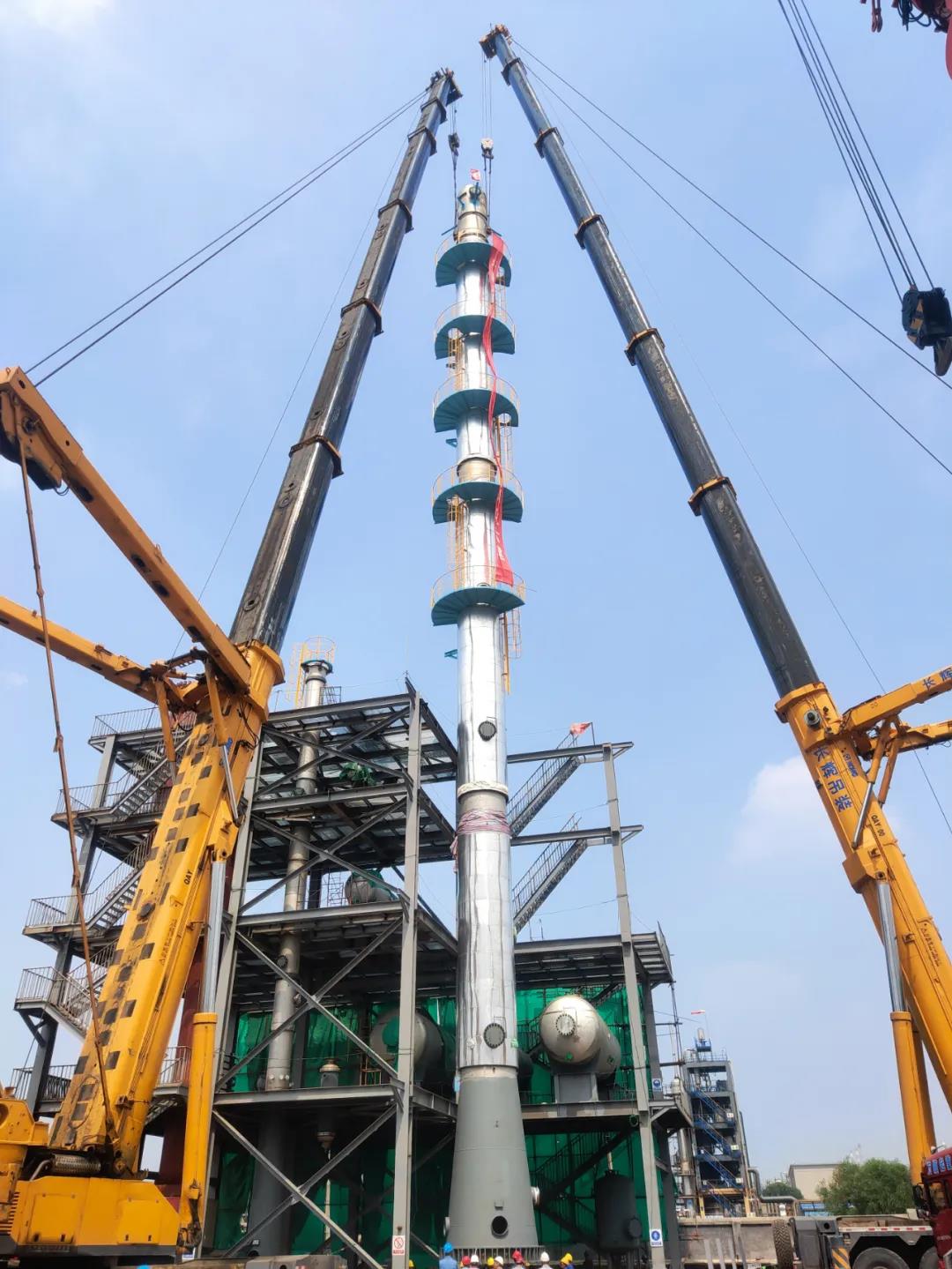 山东分公司叔丁胺技改项目最高设备吊装成功