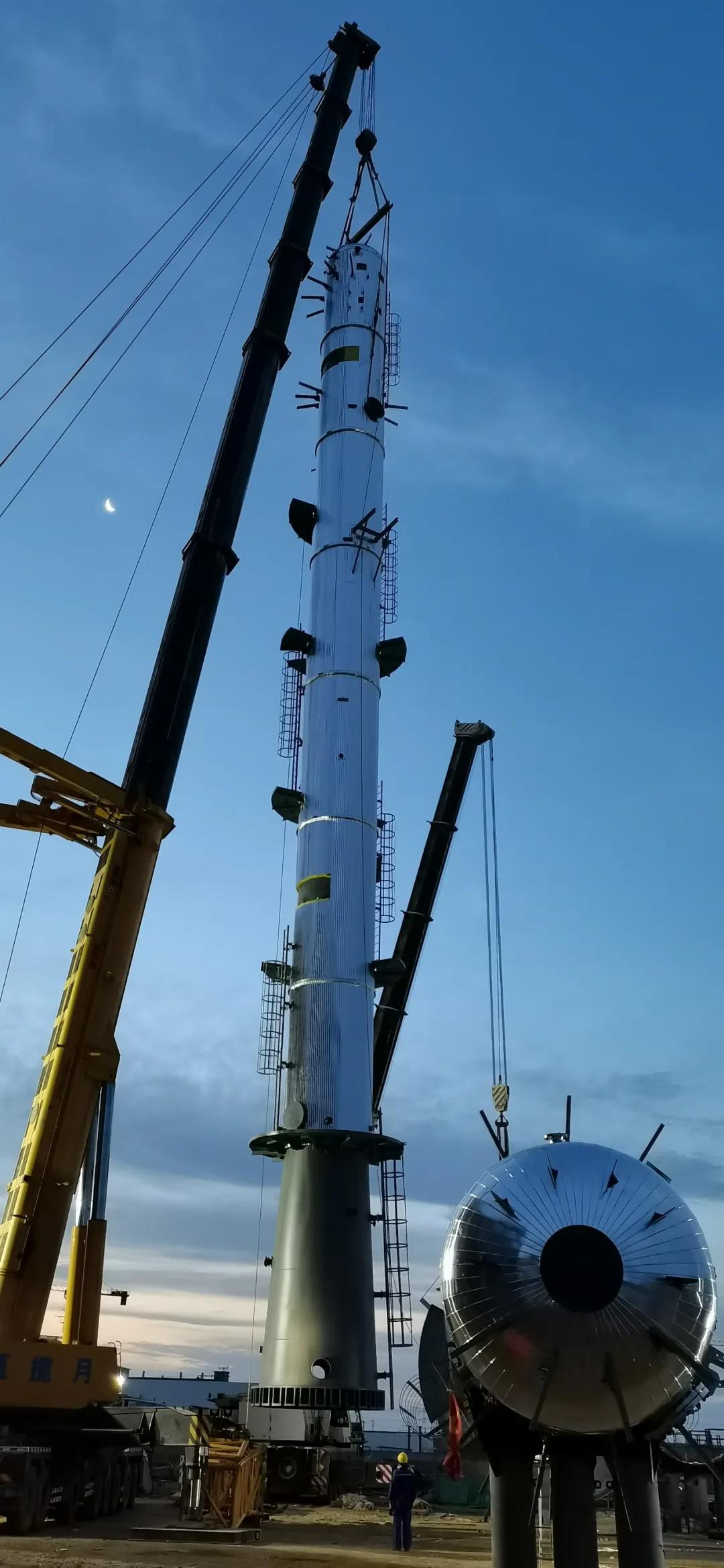 为确保此次吊装顺利,西北分公司综合考虑吊装环境、设备情况与施工质量及成本,经反复论证,采用双吊车抬送法吊装,一台650吨吊车(即主吊车)抬头部,完成从起吊抬头到就位的整个过程,一台350吨吊车(即溜尾吊车)抬尾部,配合主吊车将该设备从水平状态吊装到垂直状态后,350吨辅助吊车摘钩。待设备稳定后,650吨主吊车将设备吊到基础正上方。最终氯磷一塔历时2个小时、氯磷二塔历时40分钟,顺利吊装完毕。