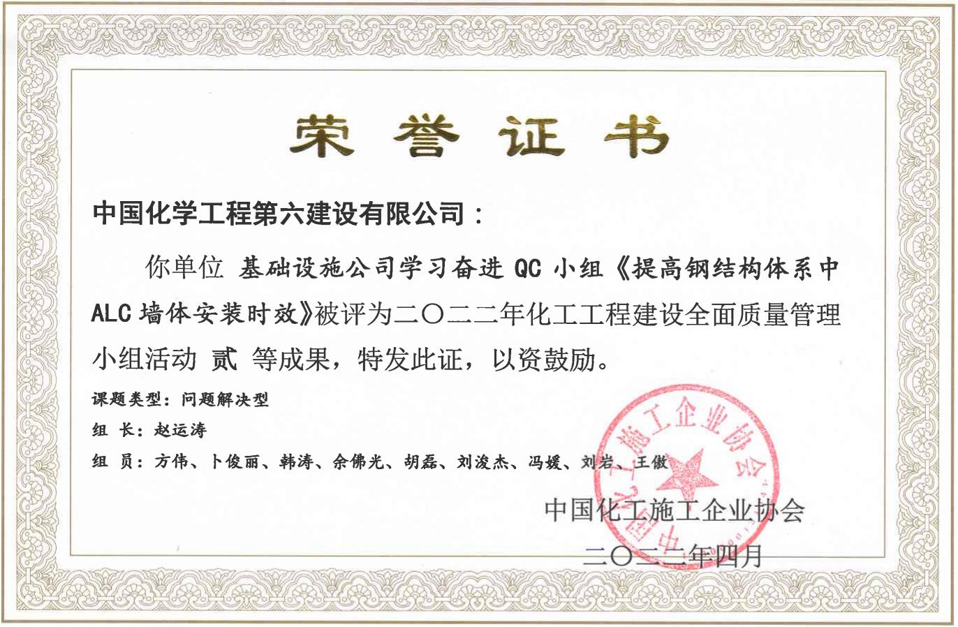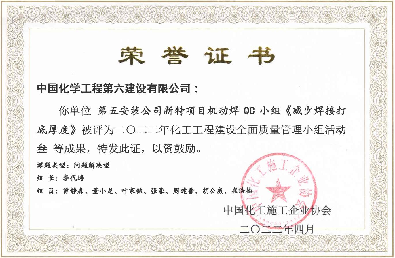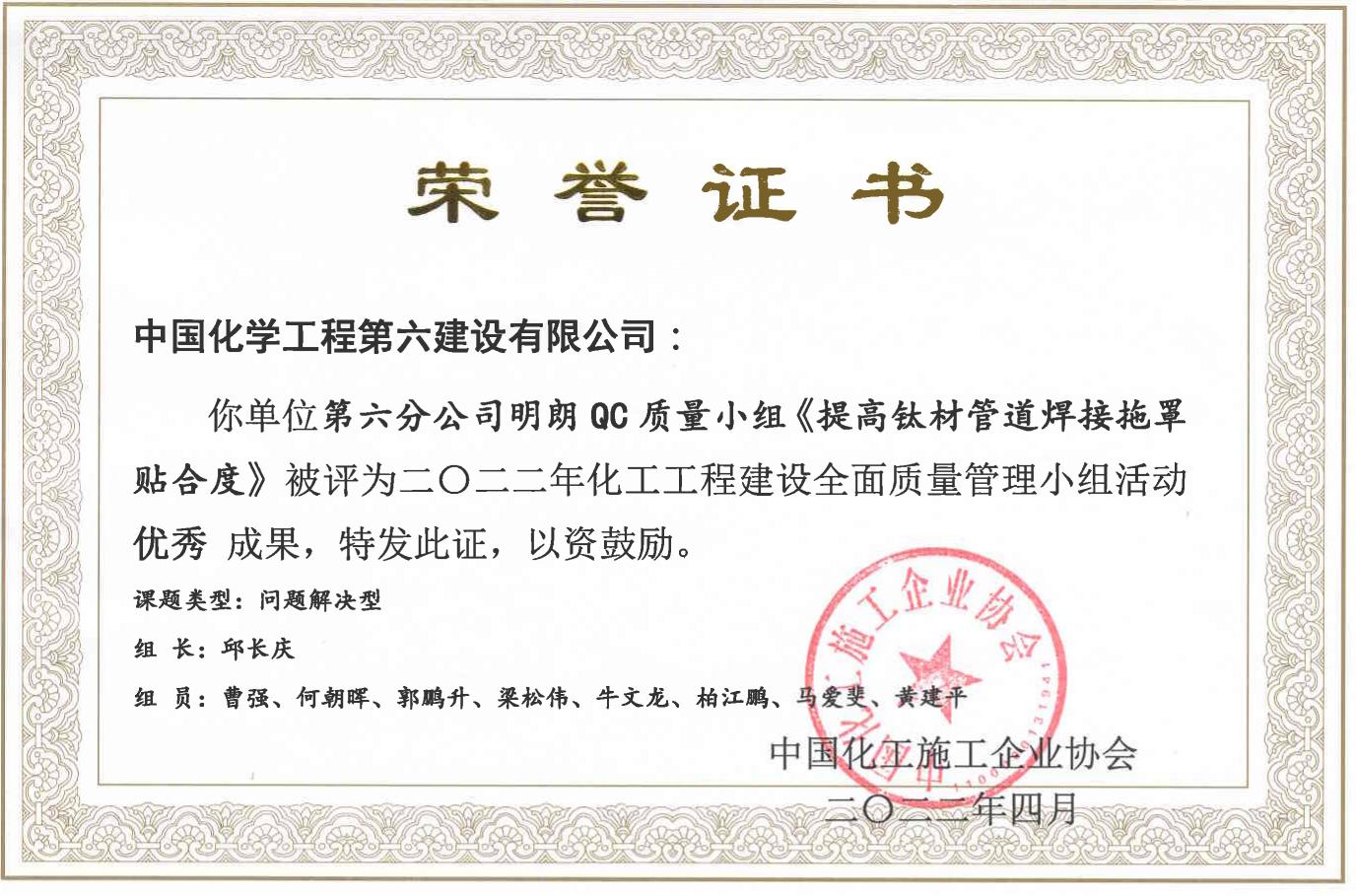 2022年开展全面质量管理小组活动优秀成果(部级)