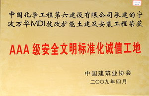 2009年宁波万华MDI技改扩能土建及安装工程获AAA级安全文明标准化诚信工地奖
