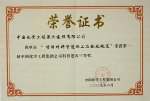 2009年特殊材料管道施工及验收规定荣获第一届中国化学工程集团公司科技进步三等奖