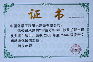 宁波万华MDI技改扩能土建及安装项目获2008得亲AAA级安全文明标准化诚信工地