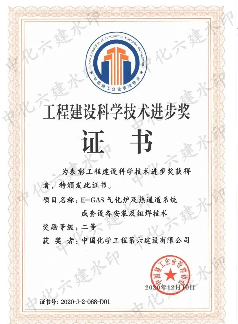 六化建申报的的E-GAS气化炉及热通道系统成套设备安装及组焊技术获中国施工企业协会2020年工程建设科学技术进步二等奖。该技术主要由北京分公司依托承建的中海石油炼化有限责任公司惠州炼化二期项目煤气化制氢装置工程而开发。